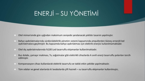Otel dış aydınlatmalarında %100 Led tasarruflu ekipmanlar kullanılmaktadır.